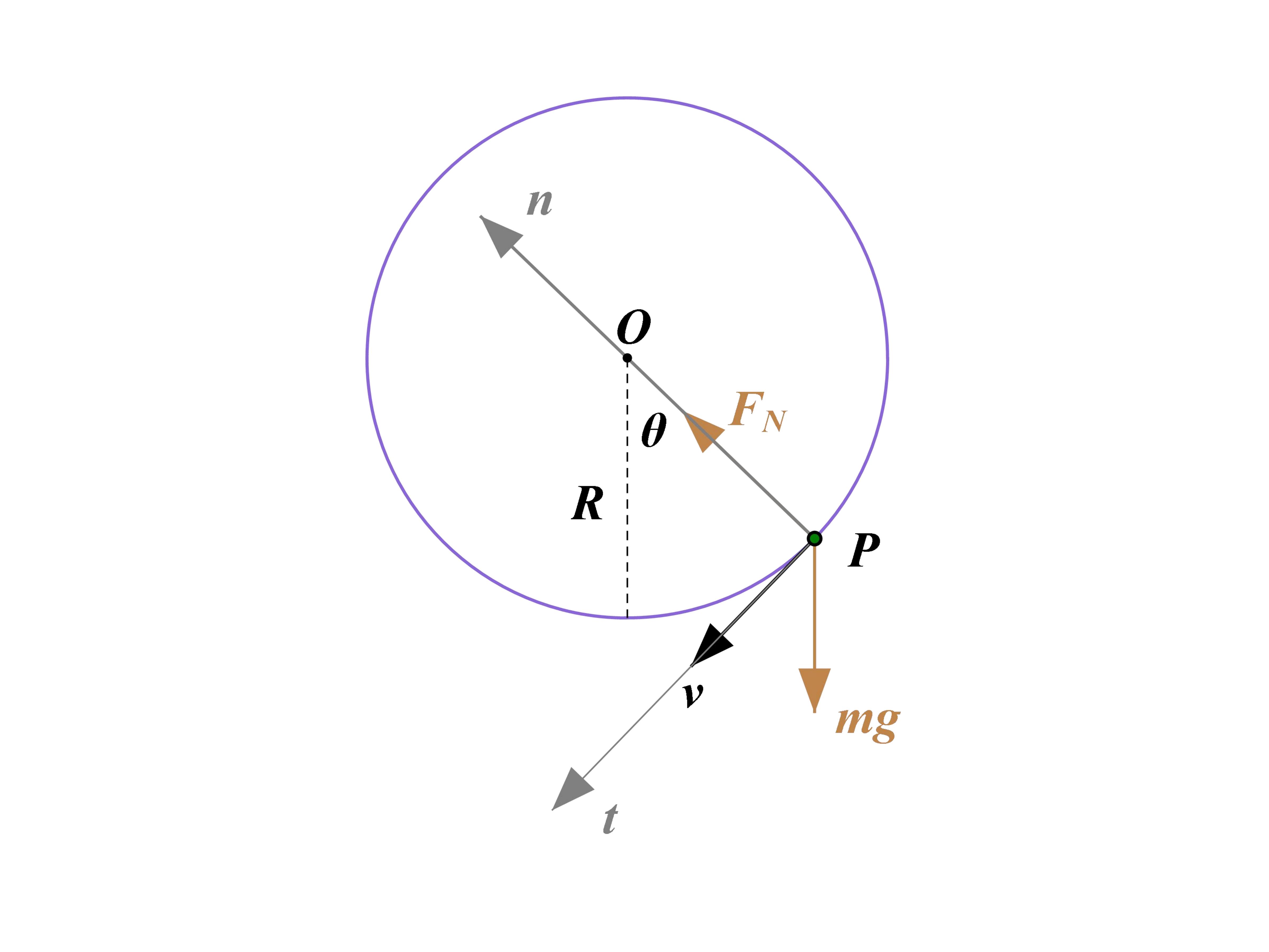 这里只看一个高中物理里的简单例子就能体会其中的复杂性。一个质量为的小球在竖直平面内沿半径为的圆形轨道做圆周运动,此刻它以速度运动到图中的点,其到圆心的连线与竖直方向成角。