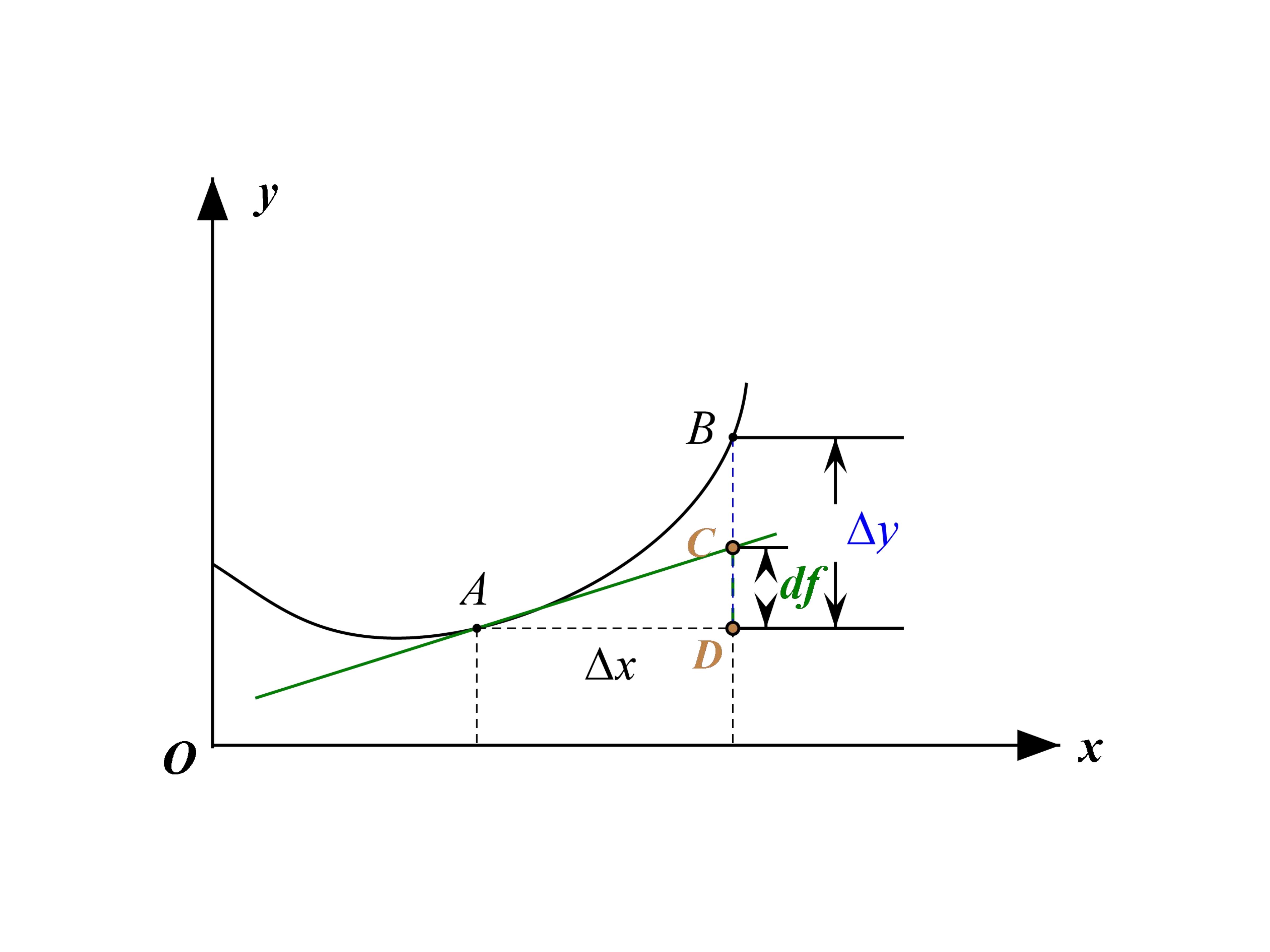 导数说完了就可以说微分了。还是看图中的切线,其与竖直虚线相交于点。其中段的距离可以表示为: