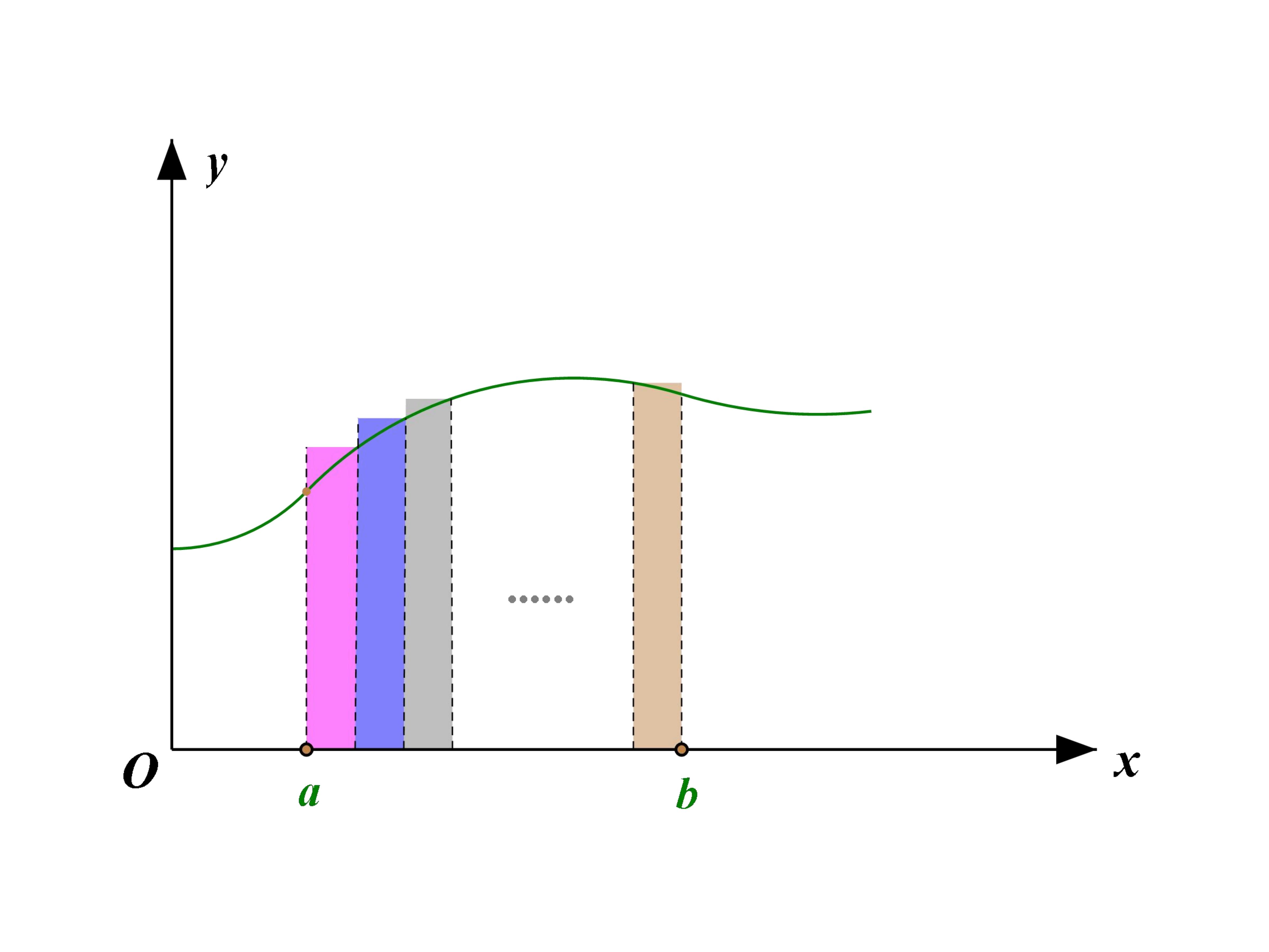 那这种朴素的思想如何用数学语言来描述呢?假设有一条函数曲线,在变量取值于的范围内与坐标轴围成了一个曲边梯形。当我们要计算这个图形的面积时,先把区间分割份,这样的话每一份就对应一个小区间,而每一个小区间就对应一个小矩形条,然后把这个小矩形条(相当于规则的地砖)的面积求和去替代曲边梯形的面积。