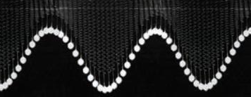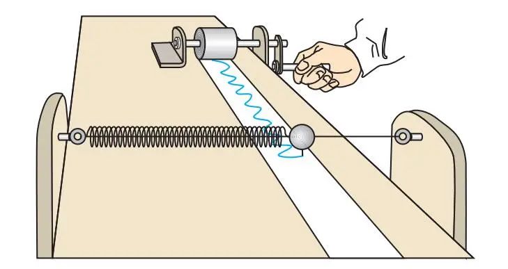 或者,在桌面上放一个弹簧振子(附一支描线笔),下面放上一条长长的宽纸带,然后在弹簧振子振动的同时在一侧把纸带匀速卷起来,这样就得到一条和频闪照片类似的图像。