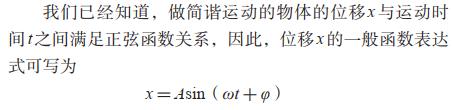我知道你一定想到了圆周运动的角速度,因为它乘以时间就是角度。不过,这里需要提醒一下,我们需要的量虽然与角速度在单位上相同,但它并不是物体旋转时的角速度,因为这里的振子并没有体现出旋转的意思。但是我们依然可以借用这个符号,把这个量写成  。这样,振动方程进一步被优化成了下面这个样子: