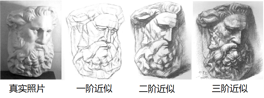 大家不要被这么一长串公式给吓着,怎么理解它的意义呢?我们通过分析一副石膏像的素描过程来理解它。