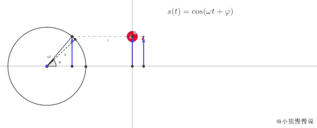 既如此,我便可以制作一个动图,把匀速圆周运动与简谐振动联系起来了。就像下面这样子: